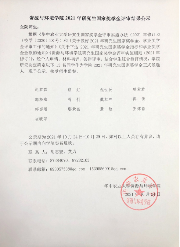 9428cn太阳集团2021年研究生国家奖学金评审结果公示
