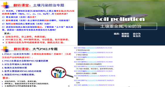 环境化学教材的编写主要依据大气圈层、水圈层以及土壤圈层的环境化学内容开展。在教学设计过程中,为了调动学生的积极性,也为了使每一个同学参与,课程在线讲授和翻转的形式进行,要求学生学习完每一章节理论知识后,依据每一个章节设计的专题,以小组为单位,分工协作,下去查阅资料,并在课堂上以PPT展示所查资料(如下图)。通过角色的转变,使学生站在主人翁的角度,参与到课堂的学习,使学习效果最大化。