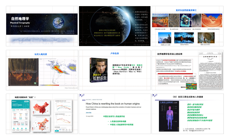 如何让学生“足不出户,便知天下”?通过搜索引擎、文献、著作、公众号等途径收集自然地理学相关的信息(静图、动图、动画、视频、影片、......),然后筛选,分别融合到20次课堂的教学专题当中。