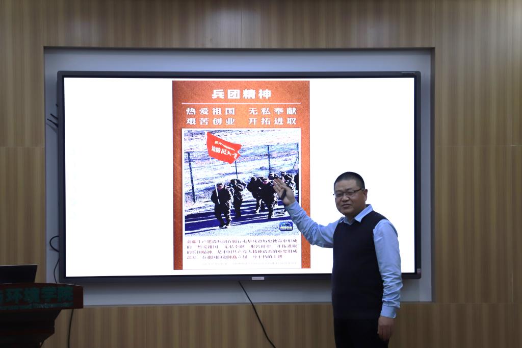 随后姜存仓结合自己援疆时的所见所闻,向同学们介绍了兵团,并流露出了对新疆的“兵团精神”深深的钦佩之情。他说道:“热爱祖国、无私奉献、艰苦创业、开拓进取,这些词语可能许多人都听多了没感觉了,但我来了新疆后才发现,这里的人是在用汗水和鲜血来诠释什么叫兵团精神。”姜存仓说,这些军人们,他们很多人就是献了青春、献终身,献了终身、献子孙。只为建设更好的祖国。