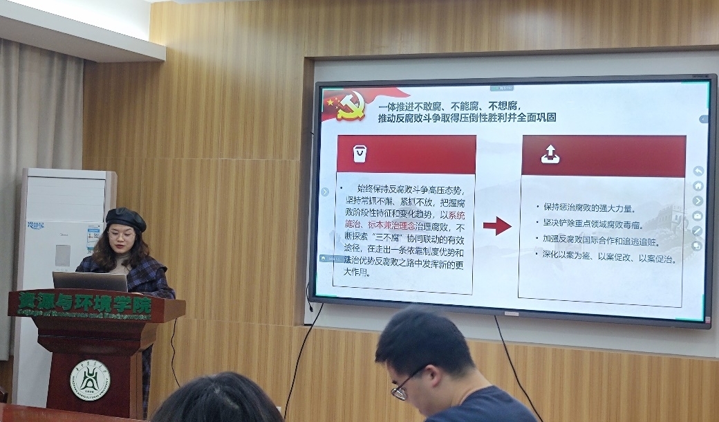 然后,聂竹君同志领学了党的二十大关于十九届中央纪律检查委员会工作报告,强调一体推进不敢腐、不能腐、不想腐,推动反腐败斗争取得压倒性胜利并全面巩固,同时坚决整治群众身边的不正之风和腐败问题,勉励我们广大青年要坚定不移听党话、跟党走,怀抱梦想又脚踏实地,敢想敢为又善作善成,立志做有理想、敢担当、能吃苦、肯奋斗的新时代好青年。