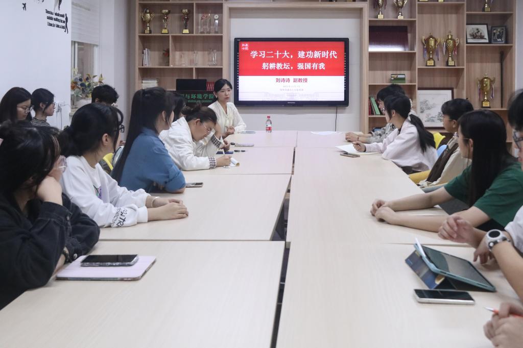 11月3日下午,“学习二十大,建功新时代”第20期教授红心工作室分享会在主楼240会议室进行,结合党的二十大报告中提到的加快建设高质量教育体系,地理信息科学专业刘诗诗教授应邀和同学们交流分享自己的入党心路和她躬耕教坛十年来对教育的看法,本科生党建办公室副主任王洪岳同学主持分享会。