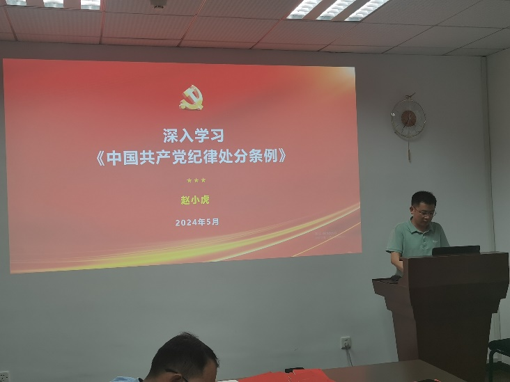 首先,支部书记赵小虎以“深入学习《中国共产党纪律处分条例》”为主题讲授纪律党课,他谈到学习《中国共产党纪律处分条例》是为了懂法纪、明规矩、知敬畏、存戒惧、筑牢可触碰的底线,接着他结合案例学习了《中国共产党纪律处分条例》第6-8章,分别以高校近些年来极个别反面教育案例为警示,领学了对违反政治纪律、组织纪律和廉洁纪律的处分。