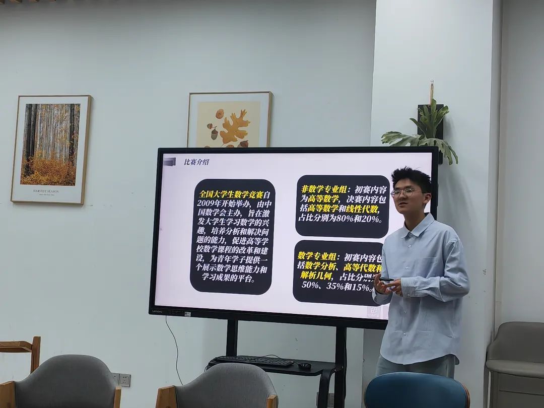 俞文杰同学聚焦全国大学生数学竞赛,从竞赛内容、时间节点及备赛策略三方面展开讲解。他提到,大数赛分为预赛与决赛,每年10月启动,题目难度梯度明显,需扎实掌握数学分析、高等代数等基础学科知识。他鼓励同学们积极参与预赛以锻炼逻辑思维,为后续科研打基础。