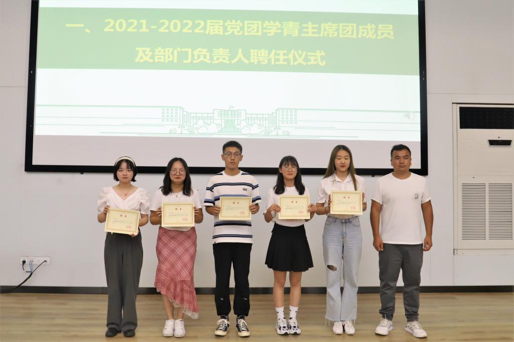 首先,许泽远、艾力·斯迪克、王阳阳分别为主席团成员及党团学青相关部门主要负责人、新生班主任助理和下班党员颁发聘书,刘成帅、甄诚分别为2020-2021年度优秀部门、公共服务先进个人颁奖。