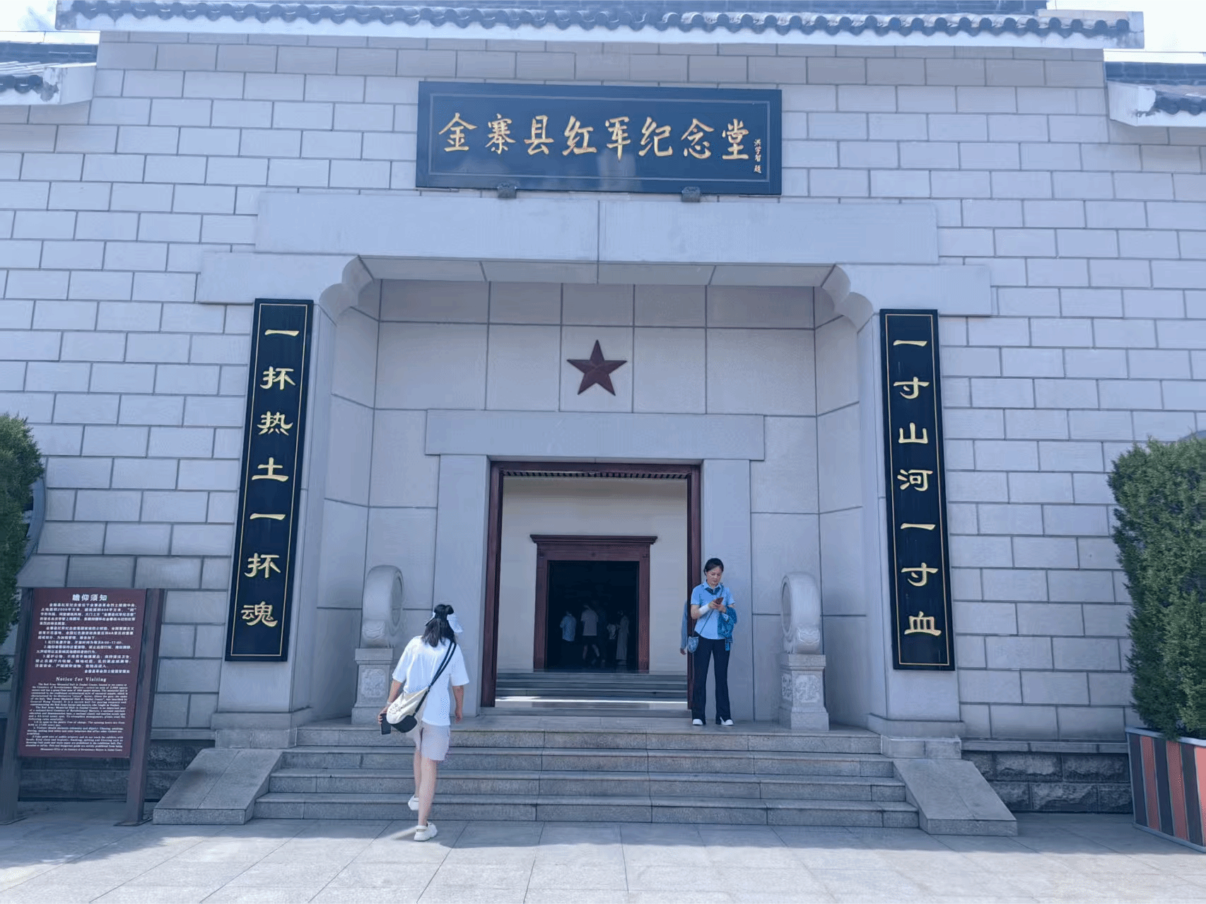 在金寨县红军纪念堂,门楣上的馆名由洪学智将军亲笔题写,两侧镌刻着习近平总书记2016年视察金寨时的题言:“一寸山河一寸血,一抔热土一抔魂”。作为全国唯一的红军纪念堂,这里庄严肃穆,承载着十万金寨儿女参军参战的壮烈历史。