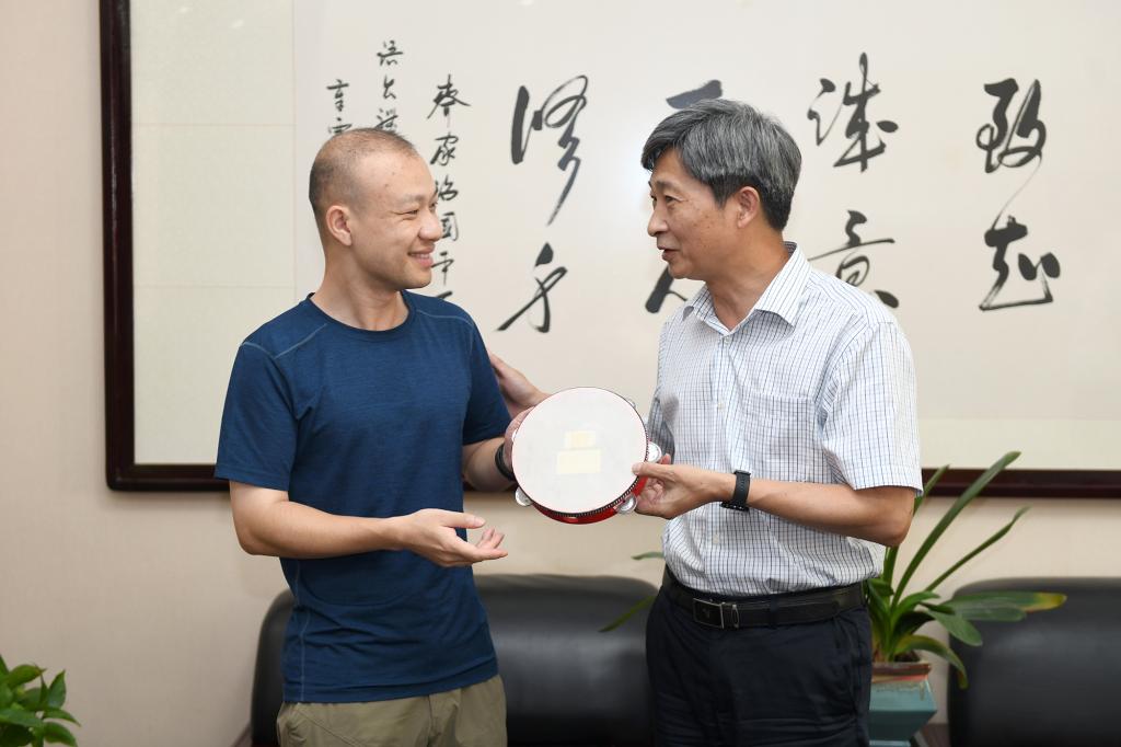 校党委书记高翅教授向廖国瑞赠送“狮山铃鼓”(记者 刘涛 摄)