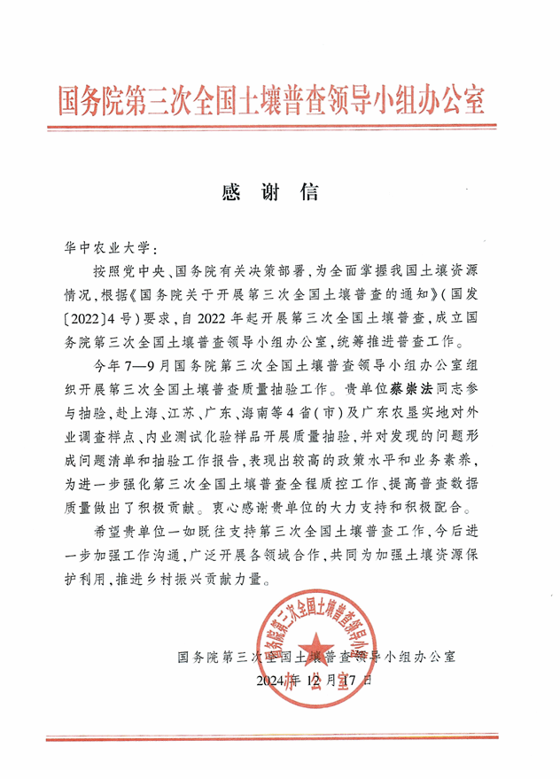全国土壤普查办向我院蔡崇法教授致感谢信