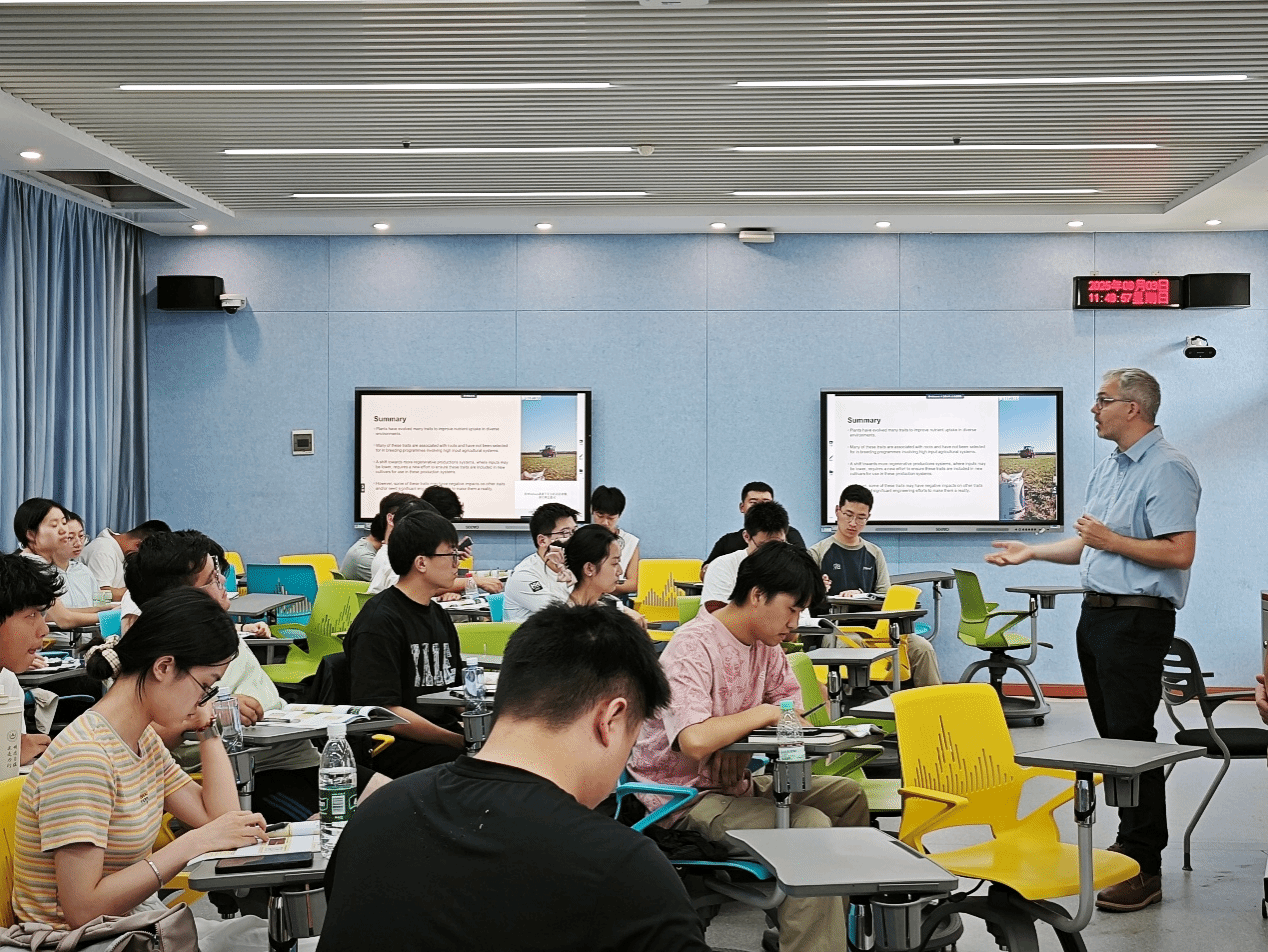 课程紧密围绕全球农业面临的挑战,大量融入了植物营养及其相关学科的最新研究进展。来自不同背景的同学们纷纷表示收获丰厚。外国语学院李光馥同学分享道:“作为非专业学生,我之前对农业的理解比较表层。这门课不仅让我学到了专业知识,更促使我开始思考农业与人类未来的深刻联系。”公共管理学院余文乐同学则对再生农业理念印象深刻:“再生农业通过更环保高效的方式实现可持续生产,其五大原则为农业转型提供了清晰路径。”食品科学技术学院肖硕瑾同学则关注科技应用:“精准灌溉等农业科技如果能与生态农业相结合,将为作物生产同时注入科技力量和生态之美。”行政管理专业李瑜同学深有感触:“小组讨论打破了学科界限,不同专业的视角碰撞让我深刻认识到,农业绿色发展同样离不开多学科的协作。”