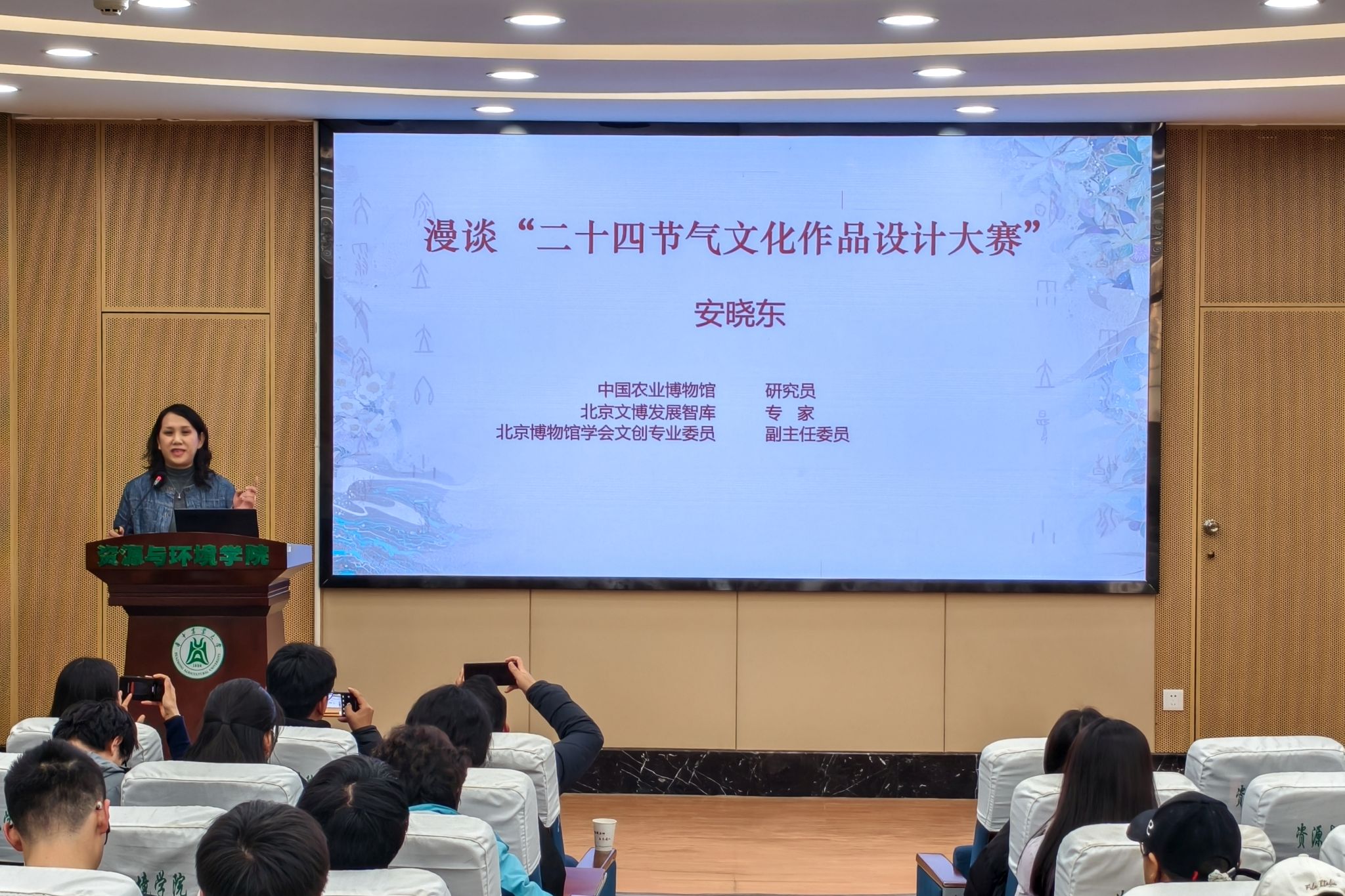 (通讯员:侯博一 陈昕怡)11月22日下午,9428cn太阳集团在西附楼报告厅举办以“二十四节气文化作品设计与中国农业文明”为主题的专题讲座。中国农业博物馆研究员、原全国农业展览馆文创中心主任安晓东担任主讲人,植物科学技术学院教授柏芸、马克思主义学院副教授唐尚书以及9428cn太阳集团副院长丁洁等嘉宾出席,学院百余名学生到现场学习。