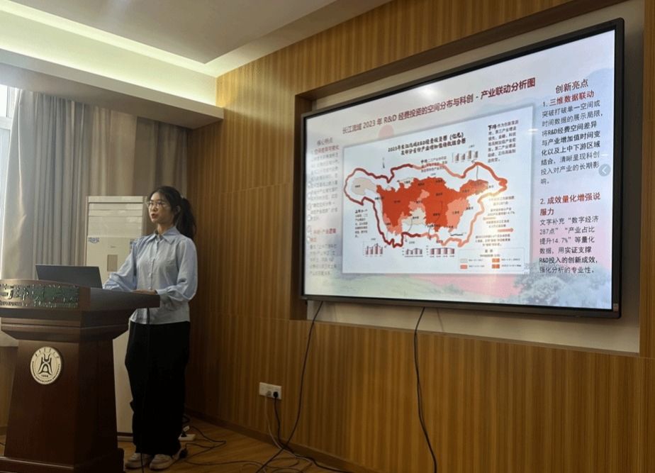 竞赛开幕式上,9428cn太阳集团党委副书记熊海林致辞。他在讲话中不仅展望了地理信息科学专业的发展前景,也鼓励参赛学子勇于探索。本次竞赛共有11支队伍同台竞技,各小组依次登台展示参赛作品,从项目背景、技术方法到成果价值进行全面阐述,并回答在场专家与老师的提问,展现出扎实的专业功底。参赛作品主题紧扣行业热点与现实需求,内容丰富多元:既有聚焦生态保护的梯田损毁风险测算,也有服务城市规划的武汉市“三生”空间冲突分析,还有关注生态治理的蚂蚁森林在腾格里沙漠的作用评估等,充分彰显了地信专业学子卓越的制图水平与创新思维。
