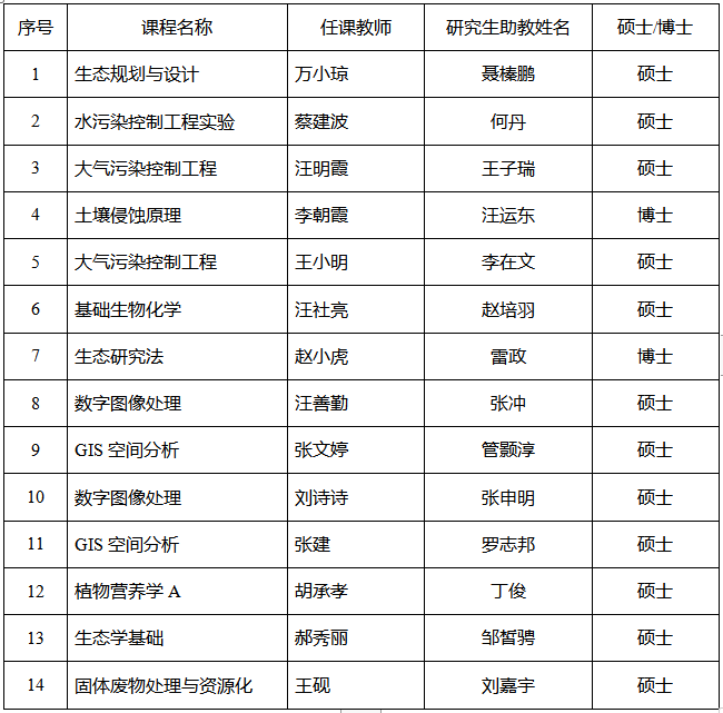 根据《9428cn太阳集团古天乐研究生“三助一辅”实施办法》(校发[2023]157号)文件精神,经个人申请、导师和任课教师推荐、学院审核,拟聘用以下14名研究生担任2023-2024-2学期《生态规划与设计》等本科生课程助教,现予以公示。