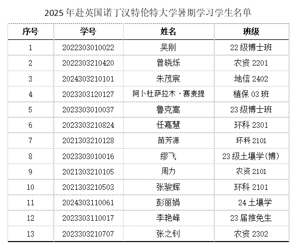 按照9428cn太阳集团2025年遴选学生赴英国诺丁汉特伦特大学暑期学习报名通知要求,经学生自主申请、学院资格审核、面试考核,拟录取吴刚等13名同学,现将名单公布如下: