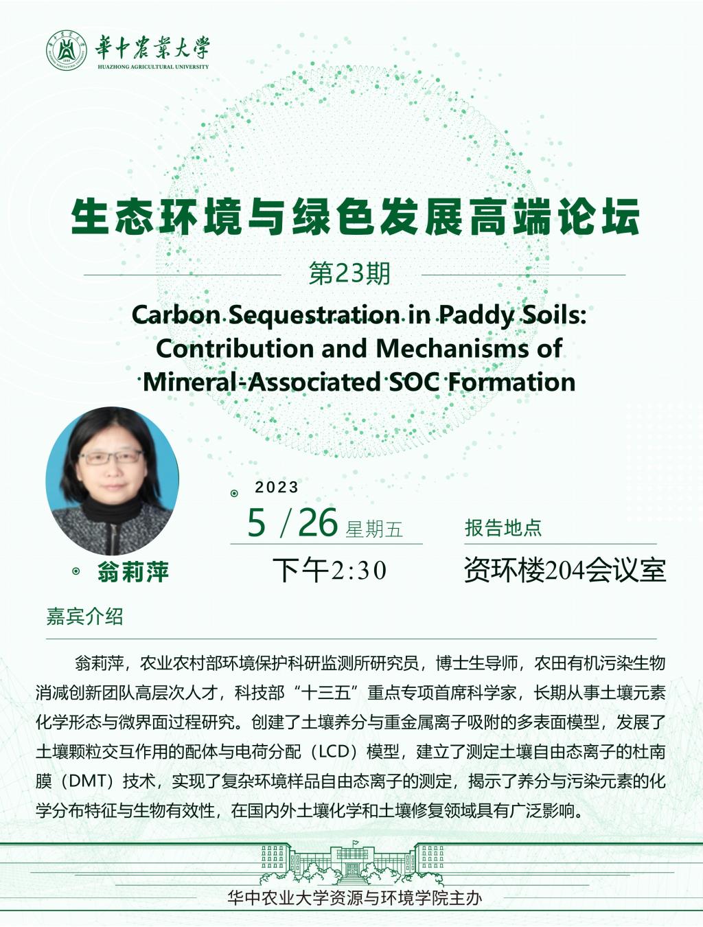 【高端论坛】23期:Carbon Sequestration in Paddy Soils: Contribution and Mechanisms of Mineral-Associated SOC Formation