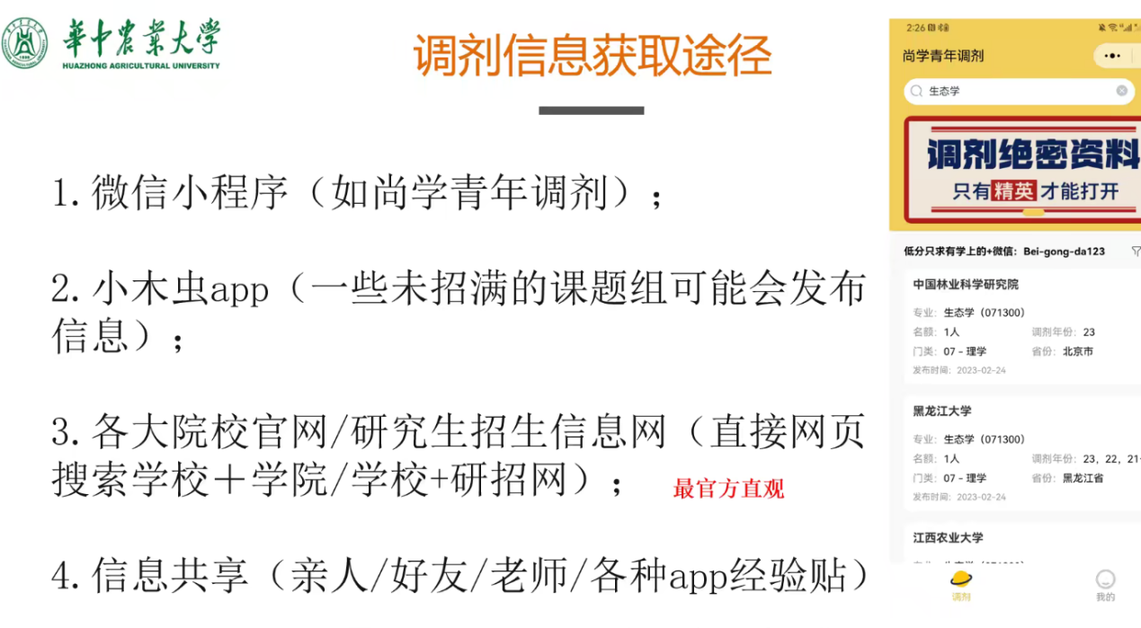 张艺博说道:“考研调剂是一场信息战,及时获取信息非常重要。”除了从各大高校的官网获取,可以通过尚学青年调剂、小木虫APP及时获取信息。在庞杂的信息流下,他建议,将调剂信息汇总成一张表格,直观清晰,完成信息收集后根据自己的初始分数和本科经历筛选学校。