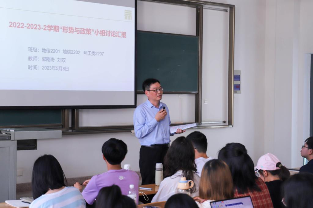 5月8日下午,校党委常委、副校长郭刚奇在第四教学楼A203教室为我院地信2201班、地信2202班及环工类2207班讲授《形势与政策》课程,马克思主义学院副教授刘双老师主持课堂。