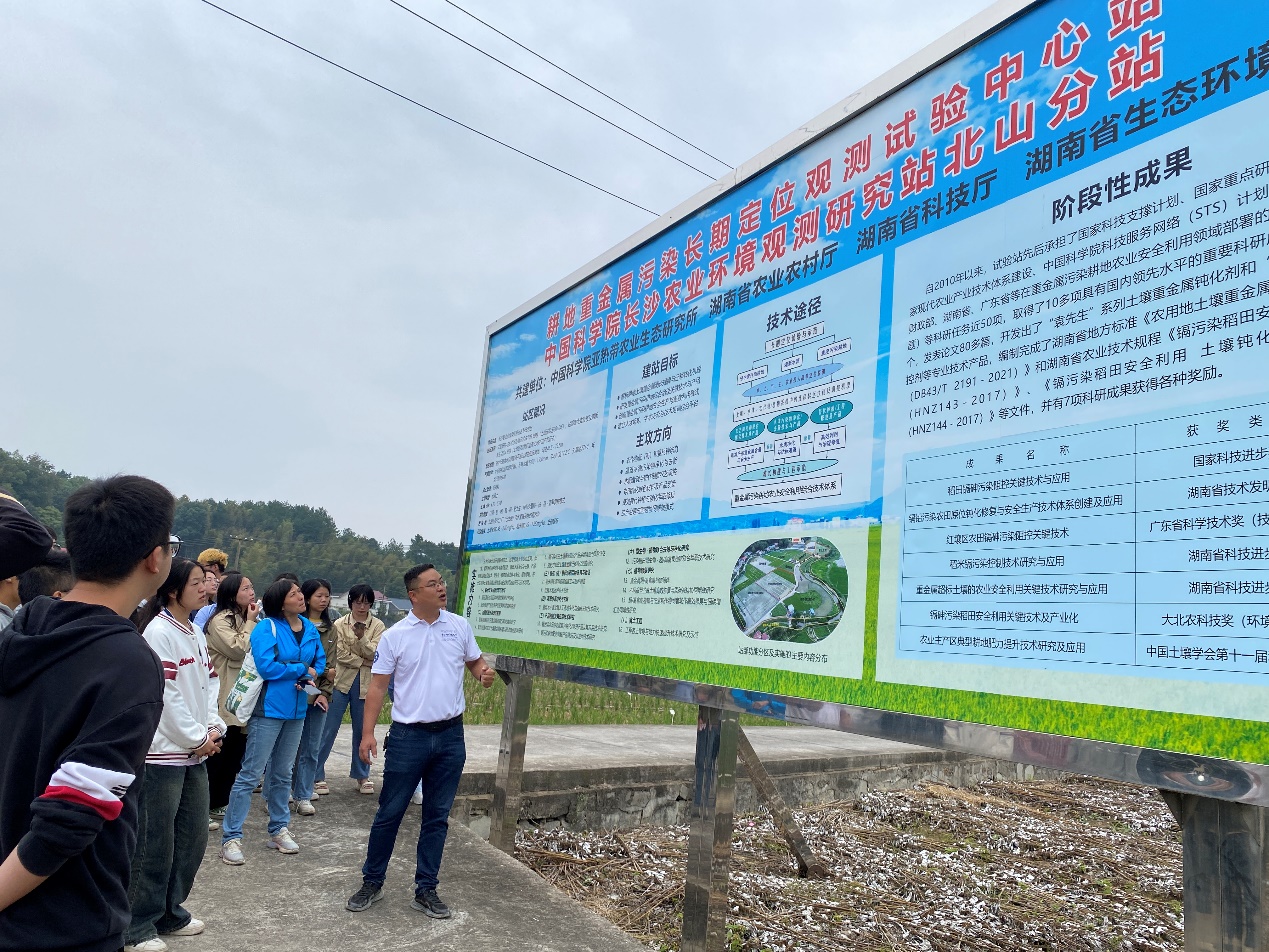 在耕地重金属污染长期定位观测试验中心站(中国科学院长沙农业环境观测研究站北山分站),朱奇宏老师向同学们介绍了站区选址原因、站区概况、建站目标等基本情况,带领同学们参观了各项技术实施内容的试验区及试验田,并详细介绍了镉污染土壤的修复治理措施及稻米镉污染控制技术等。同学们意识到解析耕地土壤重金属消长规律与迁移转化机理是漫长的过程,研发高效的可以被农民广泛接受、使用的技术与产品依旧任重而道远。