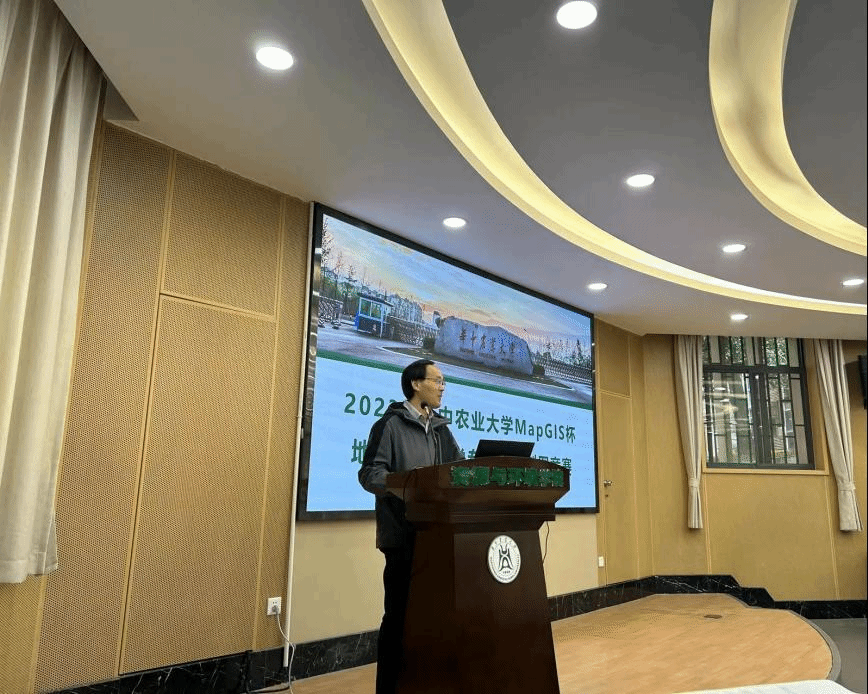 我院党委副书记熊海林出席并致辞,武汉中地数码科技有限公司副总裁黄胜辉、中地数码集团新中地教育经理方胡朝,资源环境信息工程系专业主任刘诗诗教授及资源环境信息工程系全体教师受邀出席比赛并担任比赛评委。