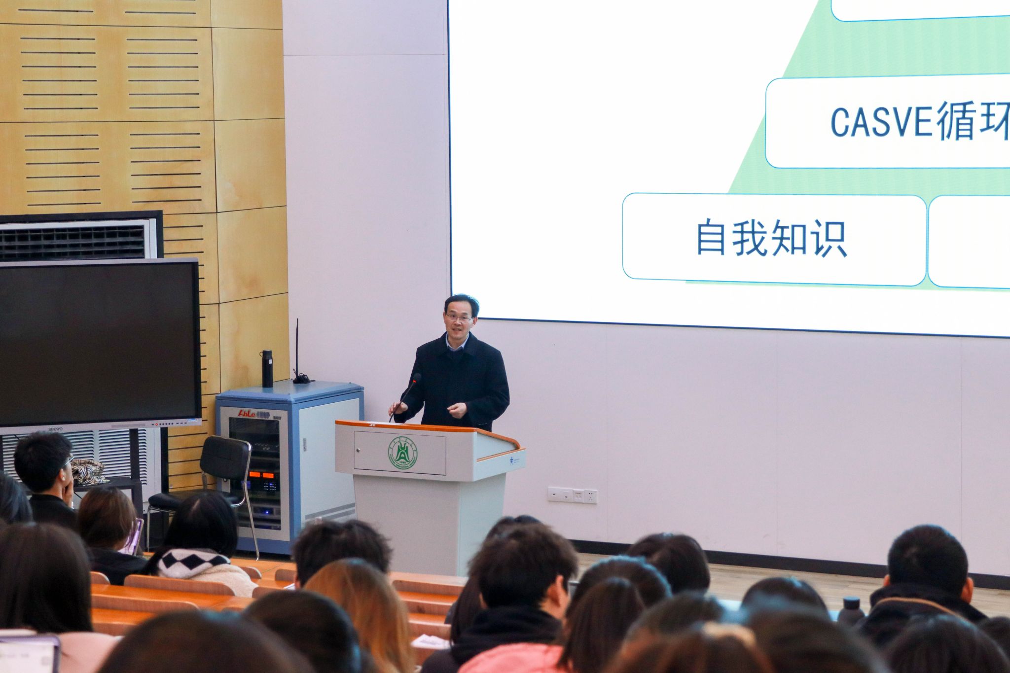 会上,熊海林围绕考研与就业的关键抉择、科学备考等主题展开深入分析,他强调,本次动员会的目的是为大家鼓舞士气、驱散迷茫,让同学们以饱满精神状态直面未来。熊海林通过对比近年升学数据指出,部分学生“并非不优秀,而是对考研准备不够重视”,只有认清形势、以质图强才能成就梦想。针对职业规划,熊海林认为应遵循“沟通、分析、综合、评估、执行”(CASVE循环)的职业生涯规划决策模型。此外,无论是选择考研还是就业,都需结合个人兴趣、能力与社会需求进行动态评估,避免跟风盲从。在实际备考方面,熊海林提出五点具体建议:一是要实事求是,结合自身实力选定目标院校专业;二是报考同类学校、同专业同学间应加强交流,共享信息、共克难题;三是主动与意向导师建立联系;四是制定科学合理时间表,对备考期进行精准规划;五是立下决心书,以坚定信念贯穿备考全程。