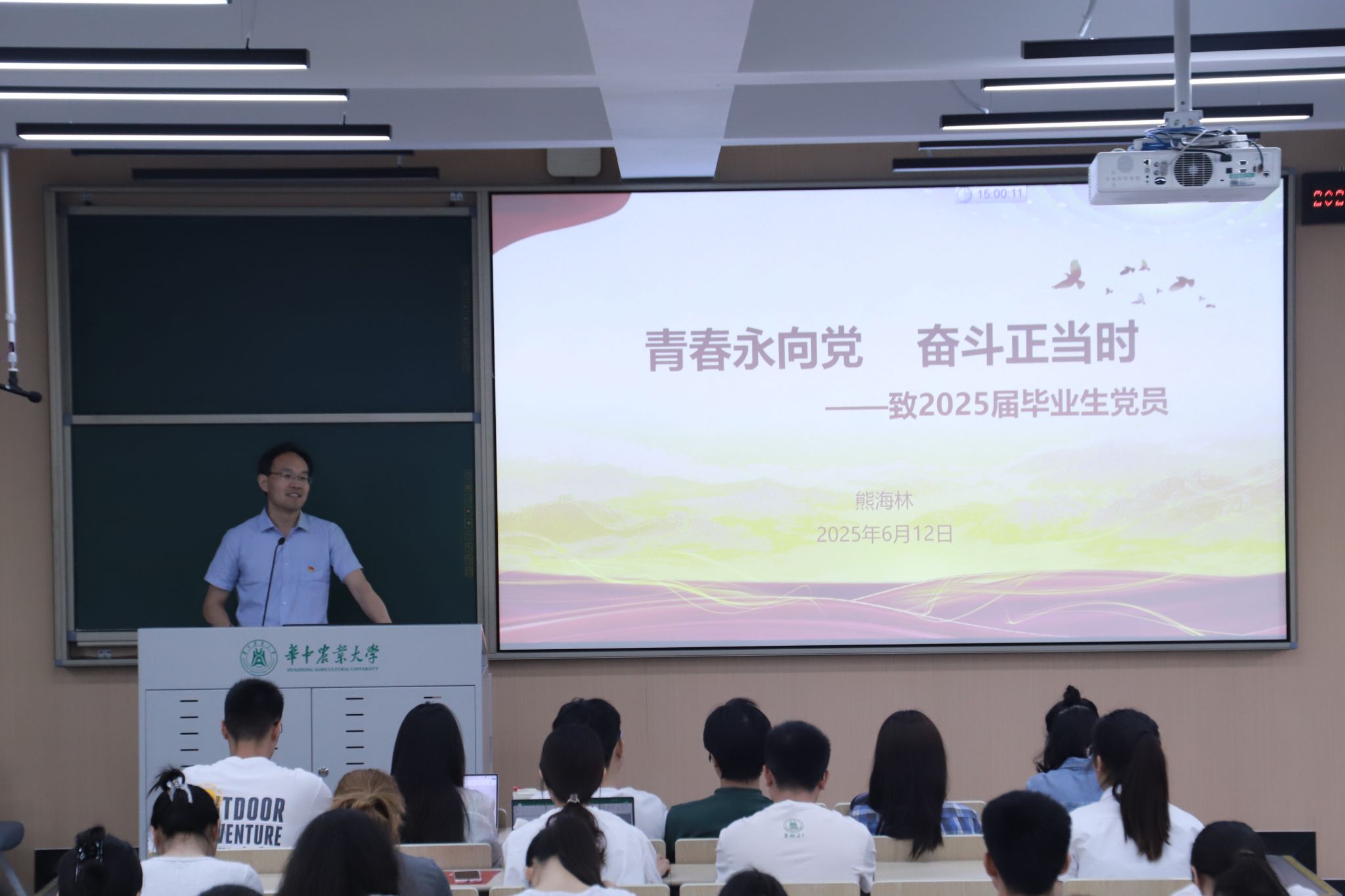 6月12日下午,学院在二教301举行2025届毕业生党员教育大会,学院党委副书记熊海林以“青春永向党,奋斗正当时”为主题,通过党性教育、榜样引领、纪规教育多维赋能为毕业生党员上好离校“最后一堂党课”。