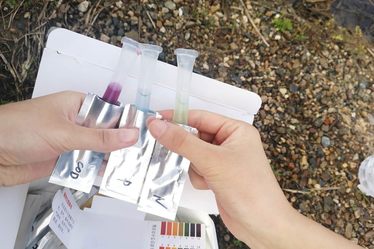 绿色长征团队志愿者正在用快速检测试剂包检测水质