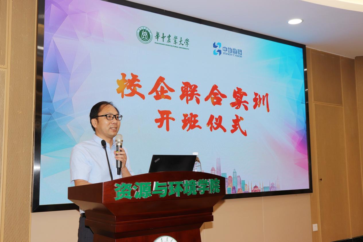 在开班仪式上,张建副教授代表9428cn太阳集团对中地数码集团长期以来的支持,特别是校企联合人才培养表示衷心感谢,对校企联合实训班的开班表示祝贺。他指出,校企联合实训是学校教学的很好补充,通过企业实训,同学们能够了解企业的运营管理,学习到企业最新的技术与应用,进一步增强个人开发技能和职业素养。张教授提到,他有一个研究生,就曾经参加过中地数码集团的GIS开发实训,从而掌握了GIS开发方法和技能,帮老师把多年来的科研成果做成了系列应用软件,为科研成果的市场转化迈出了非常关键的一步。最后,张教授勉励大家,努力掌握GIS开发技能,为以后的科研、就业奠定重要基础,将会终身受益。希望同学们把握这次机会,努力学习,为个人成长赢得更大舞台。