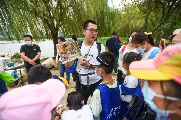 同学们观察湖面夜鹭。记者许魏巍 摄