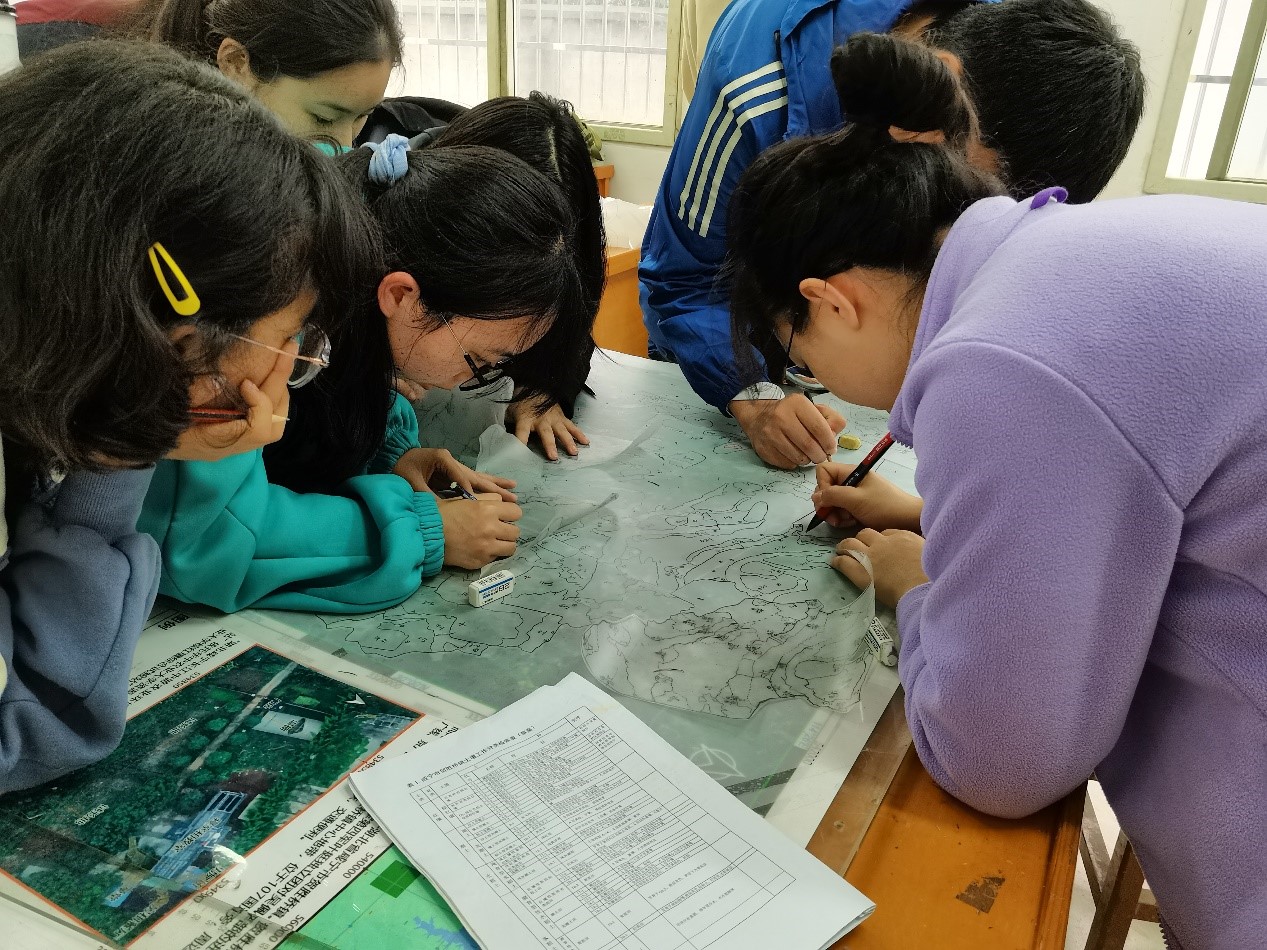 11月1日至5日,7个调查小组分别前往对应的调查区进行土壤类型调查及土地利用调查。同学们以航片为工作底图,根据路线调查和典型区域调查,逐步完成土壤类型图及土地利用类型图。在调查区域内,通过观察、访问、记载,必要时挖掘土壤剖面和进行剖面层次划分,进行土样采集,并测定土壤的pH值、石灰反应、质地等方法,对土壤种类、生产性能、土种分布范围和利用情况进行判断,在航片上划分土壤界限;依据土地用途、经营特点、利用方式和覆盖特征等因素,在航片上划分土地利用现状。